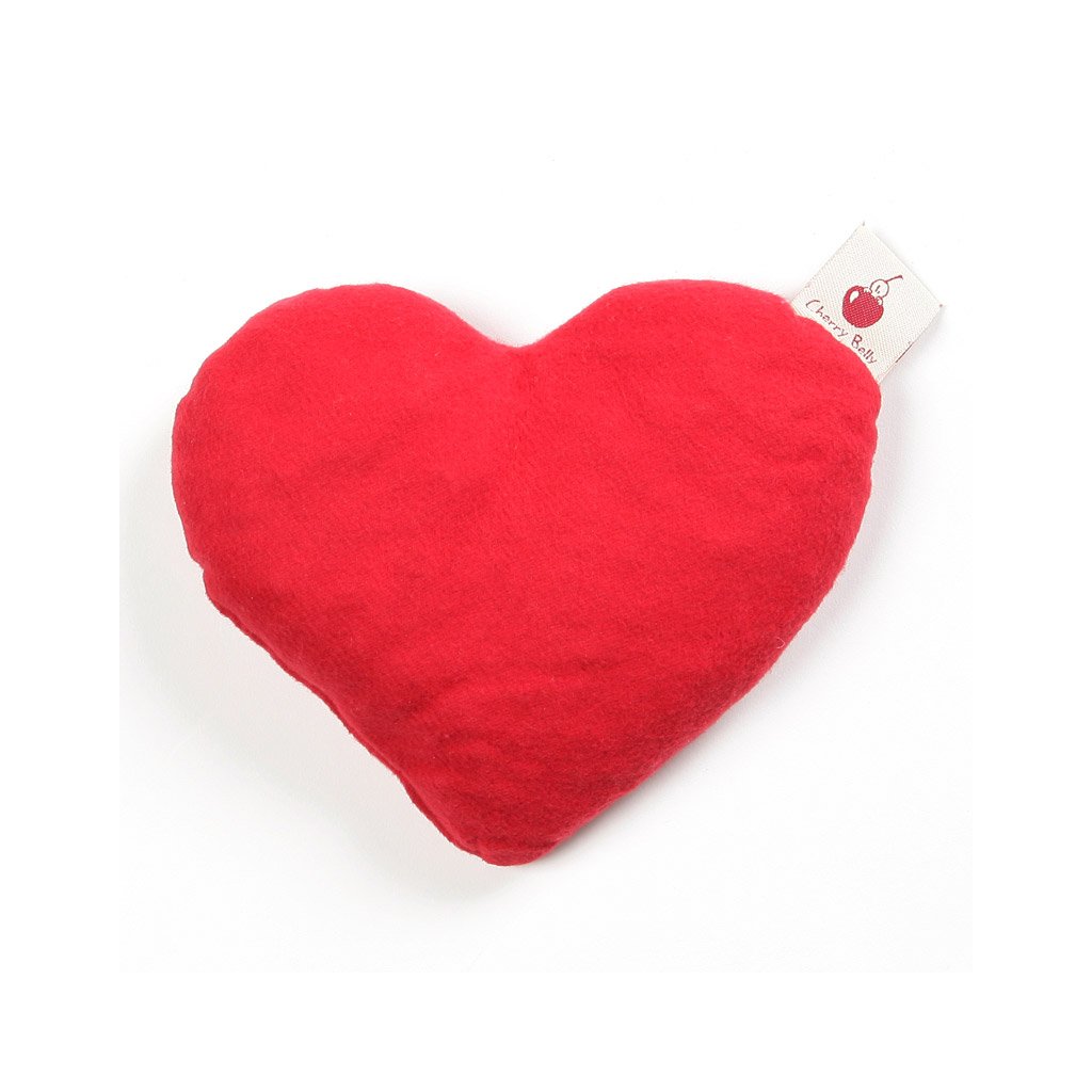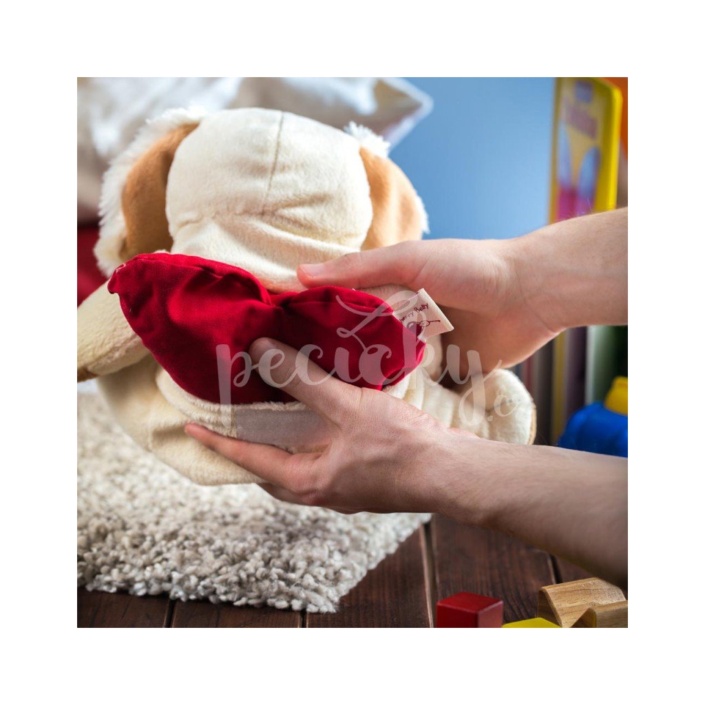 Třešňové pecky má schované v bříšku v červeném polštářku ve tvaru srdce. Srdíčko jednoduše vytáhnete díky suchému zipu na zádech plyšáka. Polštářek pak můžete nahřát v mikrovlnné troubě nebo jednoduše nachladit v mrazáku.